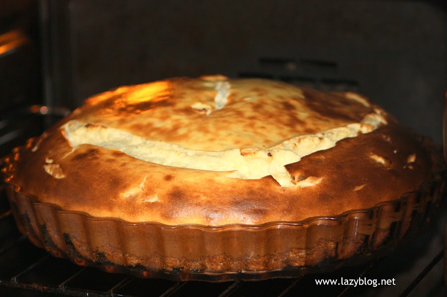 Cuando está listo el relleno, lo metemos a hornear, 10 minutos a 170º y luego otros 30-35 más, a 150º. Los tiempos dependen de cada horno. El mío, en ese tiempo hace que la masa suba como un bizcocho y que empiece a abrirse (lo veis en la foto). (No hay que preocuparse, luego baja y queda bien planita)