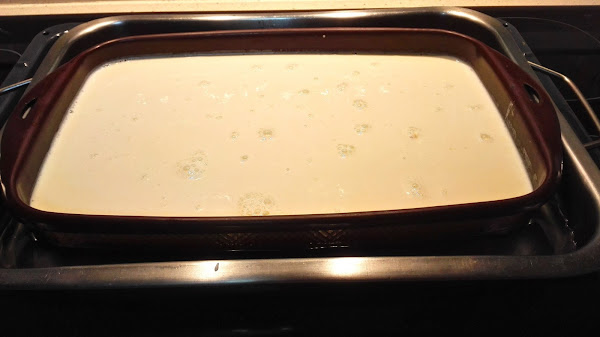 Ponemos en una bandeja al baño María, yo usé una bandeja un poco más grande que el molde y le eché 5 vasos de agua, que cubra un poco menos de la mitad del molde.