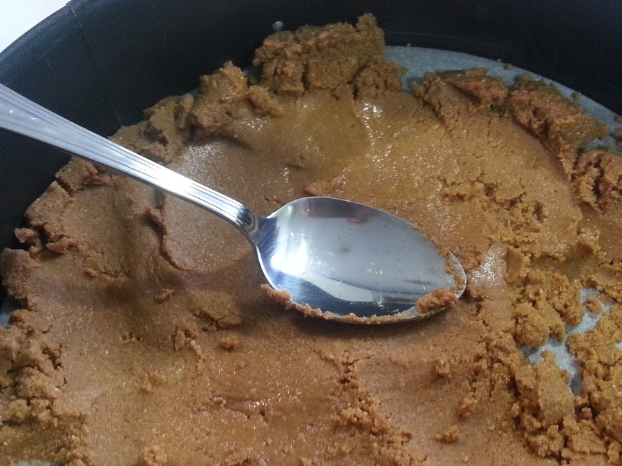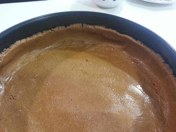 2. - Extendemos la mezcla sobre un molde desmontable con ayuda de una cuchara, que cubra tambien los laterales del molde. Y lo metemos en el congelador mientras hacemos el relleno.