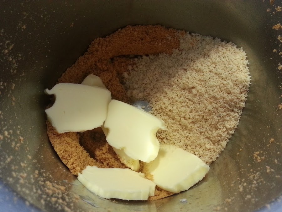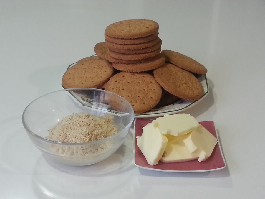 1. - Primero prepararemos la base, triturando las galletas y mezclándolas con la mantequilla blanda (yo la metí en el micro un poco) y las almendras molidas.