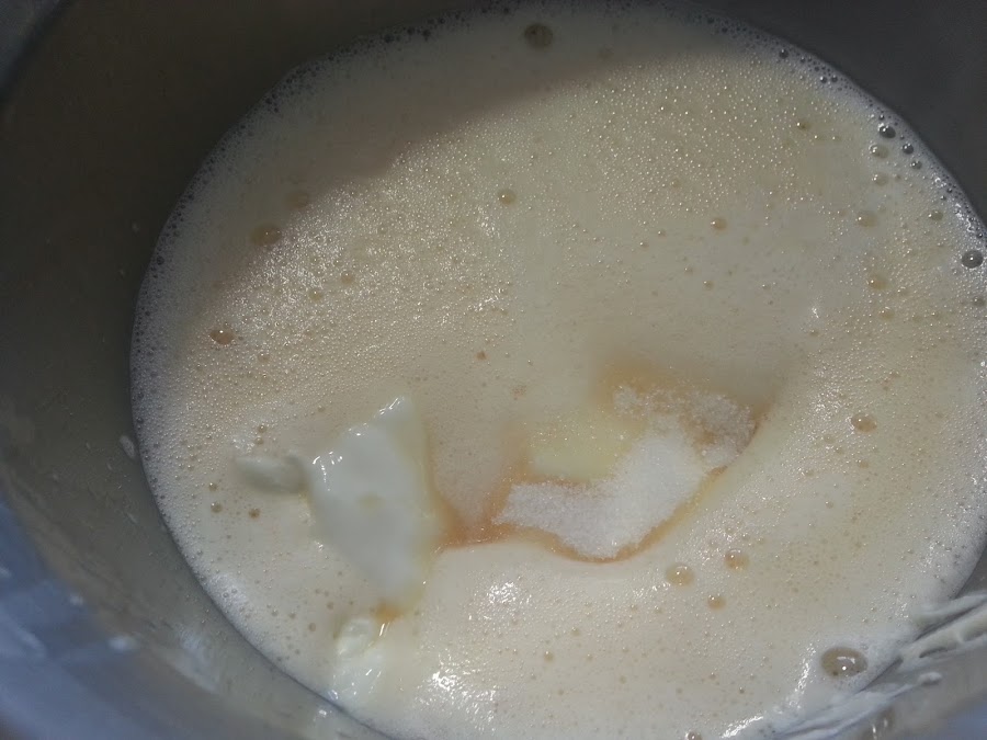 4. - Y pasamos al relleno, batimos los huevos y le agregamos la leche condensada, la nata (crema de leche), la vainilla y el queso. Y batimos todo muy bien.