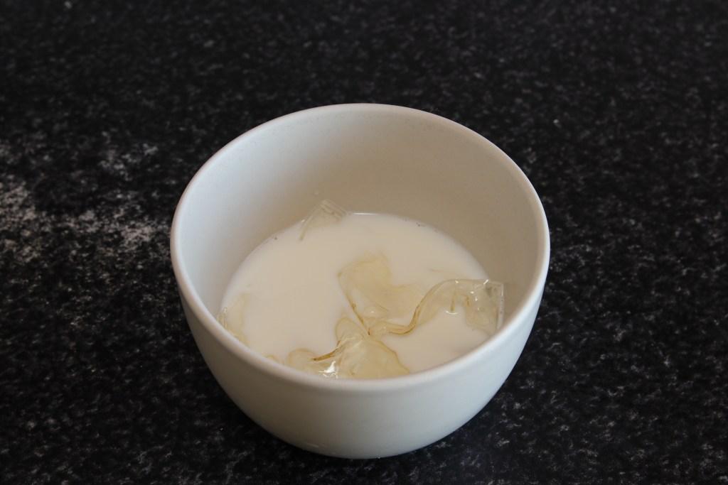 En un recipiente ponemos la leche a calentar en el microondas junto con la gelatina bien escurrida. Mezclamos bien para que se diluya y reservamos.