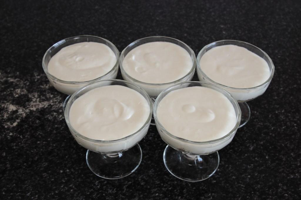 Añadimos la mezcla de la leche condensada y seguimos batiendo con las varillas eléctricas. Incorporamos la leche con la gelatina y mezclamos de nuevo. Quedará como una especie de crema. Rellenamos los moldes (las copas en este caso) y las llevamos al frigorífico al menos durante 4 horas.