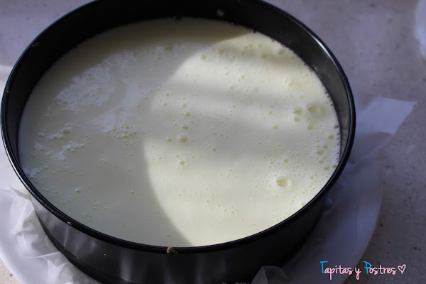 Vertemos la mezcla con cuidado en el molde donde tenemos la base de galletas.Dejamos en la nevera unas horas hasta que cuaje.