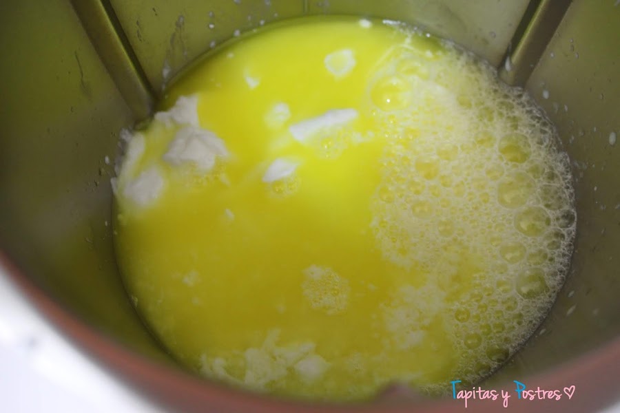 Ponemos el agua, el sobre de gelatina de limón, el queso fresco, la leche y el azúcar. Programamos 6 minutos, a 90° y velocidad 4. Al acabar escurrimos las hojas de gelatina e inmediatamente las agregamos y volvemos a mezclar 10 segundos a velocidad 5.