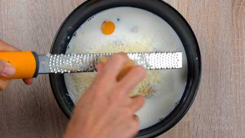 2. En un recipiente limpio y amplio agregamos la leche, los huevos, la cucharadita de esencia de vainilla, el azúcar y el queso rayado.