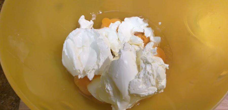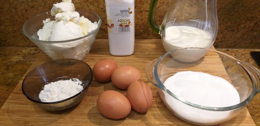 600 g de queso crema, 4 huevos, 350 ml de nata (crema de leche) líquida, 30 g de harna, 200 g de azúcar.