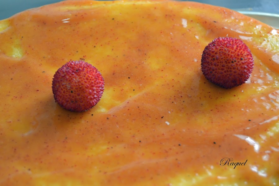 Poner en una bandeja, Ponemos la mermelada de madroños en un bol con unas gotas de agua para que quede mas liquida y calentamos unos treinta segundos en el microondas, mezclamos bien y echamos por encima de la tarta, ponemos unos madroños para adornar por encima y meter en la nevera hasta la hora de consumirla.