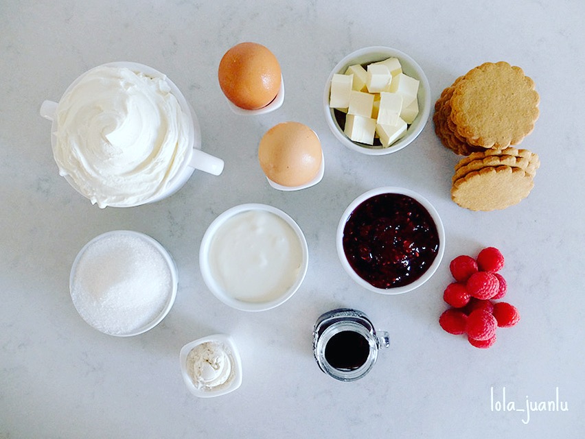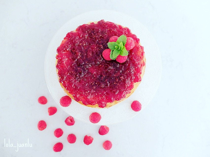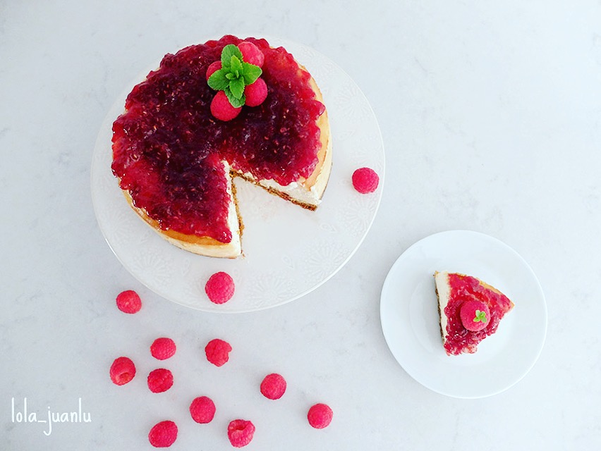 Sacamos la tarta de la nevera, pasamos una espátula por el borde para que sea más fácil desmoldarla y colocamos en una base de tarta. Cubrimos con una capa de mermelada de frambuesas y decoramos con unas frambuesas y unas hojas de menta.