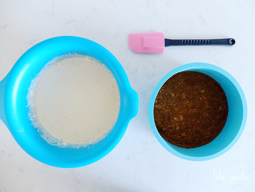 Colocamos el molde en una bandeja de horno y vertemos la mezcla de queso sobre la base de galletas.