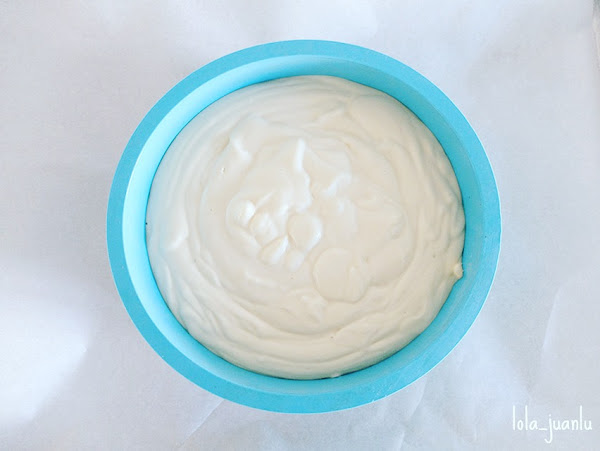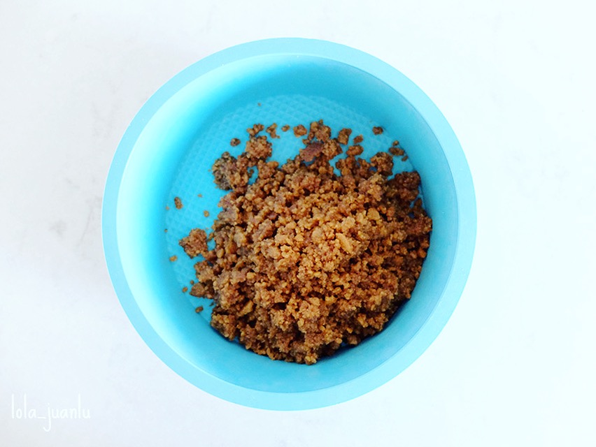 Echamos la mezcla en un molde redondo de silicona de 18 cm de diámetro. Con las manos empujamos la masa para que quede uniforme en la base del molde.