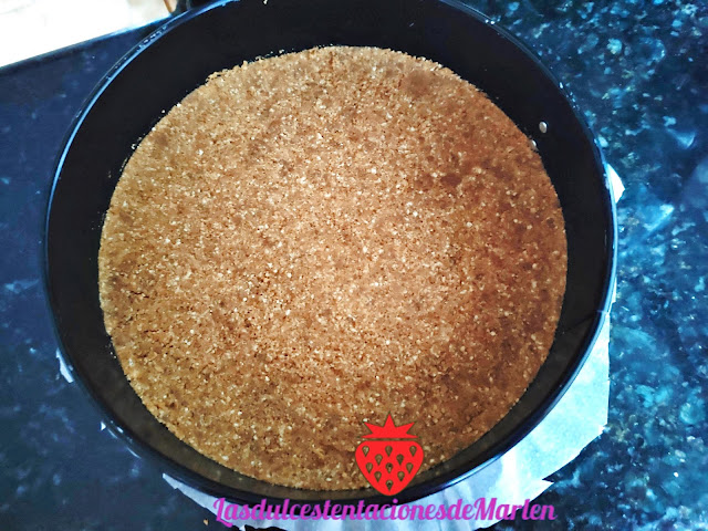 Trituramos las galletas y mezclamos con la mantequilla derretida. Formamos la base del molde presionando con una cuchara. Reservamos en el frigorífico.