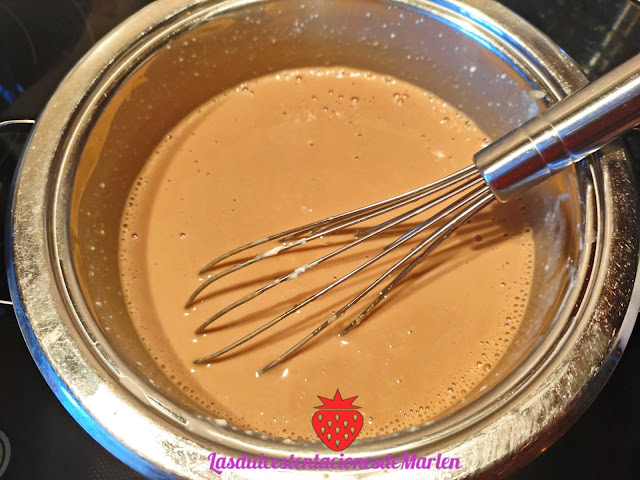 Disolvemos el sobre de cuajada en la mitad de la leche. La otra mitad de la leche la ponemos en un caso a fuego medio. Troceamos el chocolate y lo ponemos con la leche, hasta que se derrita. Moviendo con varillas manuales. Seguidamente agregamos el queso, la nata (crema de leche) y el azúcar. Batimos todo muy bien hasta formar una crema. Por último, agregamos el preparado de cuajada (seguimos removiendo) y cuando arranque a hervir, apartamos.
