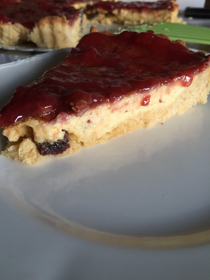 Para la base se mezcla la harina, azúcar, azúcar vainillada, la levadura, la sal, el huevo y la mantequilla a temperatura ambiente o pasada por microondas; se amasa hasta que estén bien integrados los ingredientes, se forma una bola, se envuelve (con un paño húmedo) y se deja reposar en la nevera por una media hora.