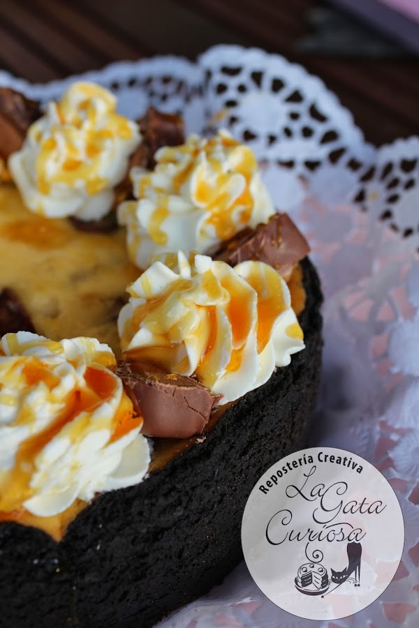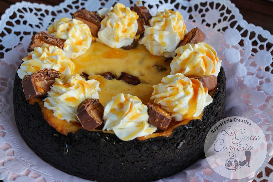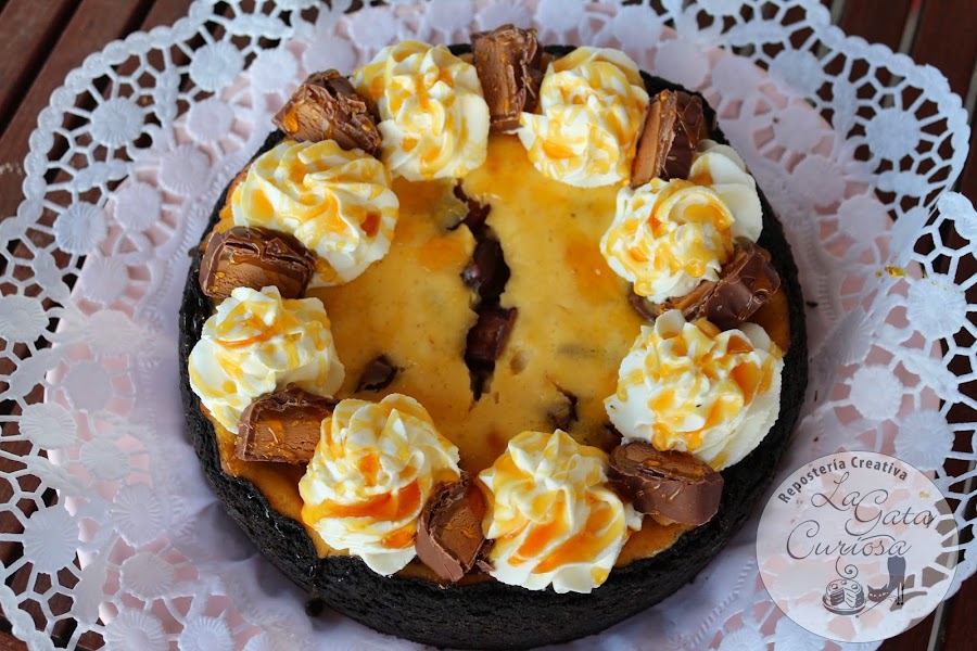 Cortamos las chocolatinas en trozos y las añadimos a la mezcla de queso y huevos, movemos para que se distribuyan bien. Repartimos la crema en la base de la tarta he introducimos en el horno previamente calentado a 165ºC (calor por arriba y por abajo) durante unos 50 minutos, pinchamos en el centro para ver si está bien cocido.