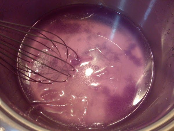En un cazo echar el agua, el polvo de violetas y las hojas de gelatinas previamente hidratadas y ponerlo al fuego.