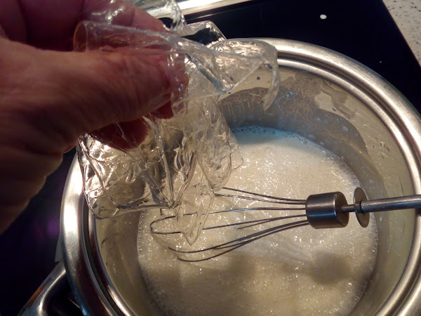 Para preparar la gelatina, poner las hojas de gelatina a hidratar en agua durante dos o tres minutos