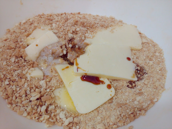 En un cuenco echar las galletas trituradas, la mantequilla a temperatura ambiente y la esencia de vainilla,