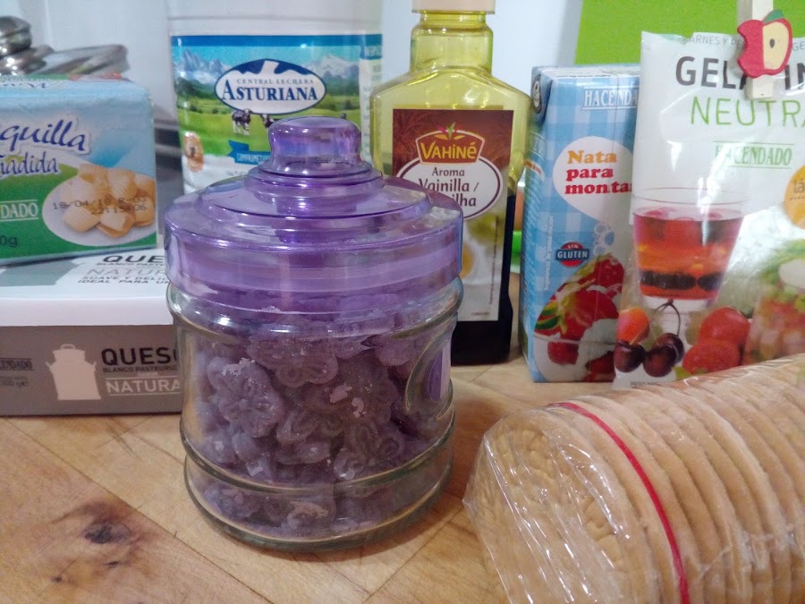 500 ml. de nata (crema de leche) para montar, 1 tarrina de queso para untar (tipo philadelphia), 5 hojas de gelatina, 200 grms. de caramelos de violeta, 125 ml. de leche.