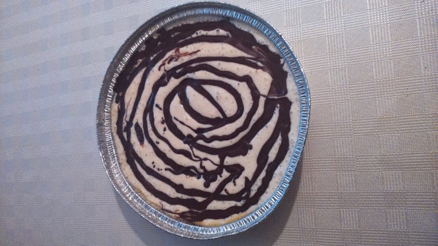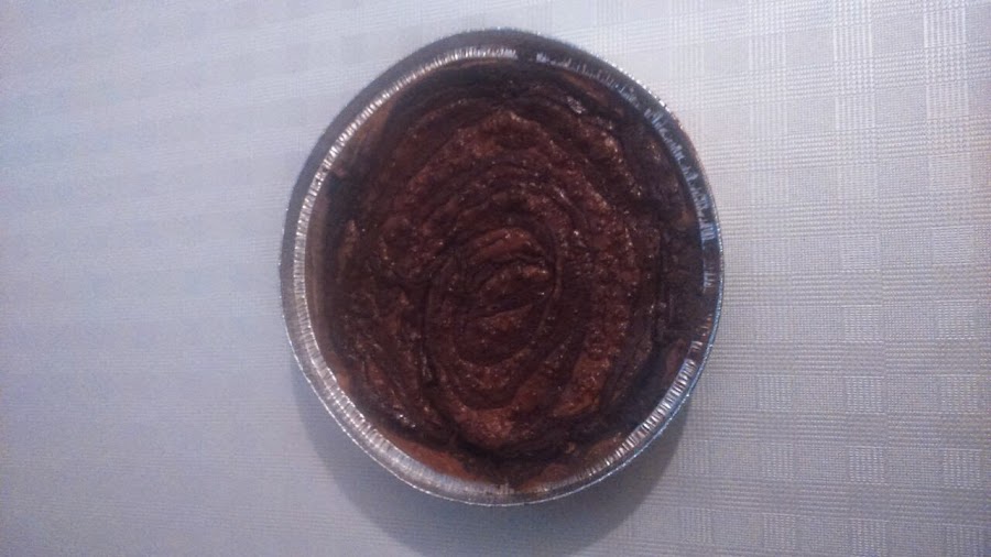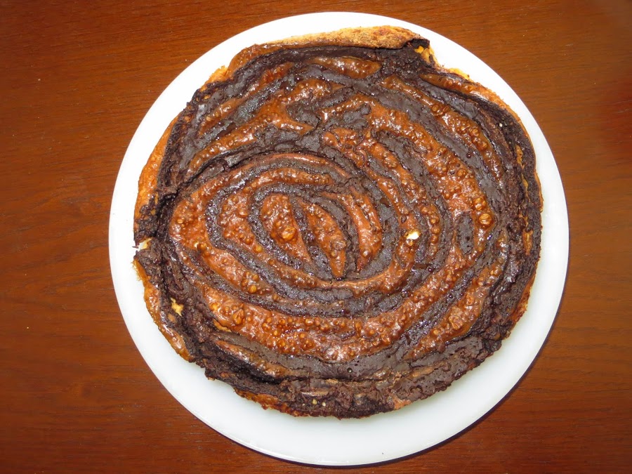 Ponemos el horno a precalentar a 160º, con calor arriba y abajo. Mientras se calienta, fundimos el chocolate al baño maría o en el microondas y lo distribuimos en pequeños montoncitos sobre la mezcla. Con la ayuda de un palillo vamos formando dibujos en espiral sobre la superficie.