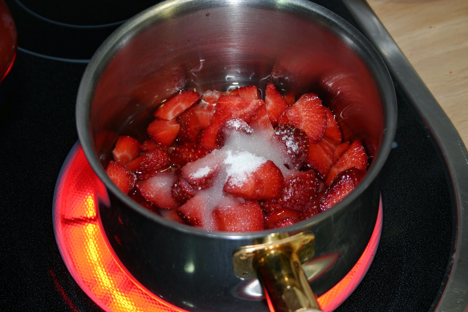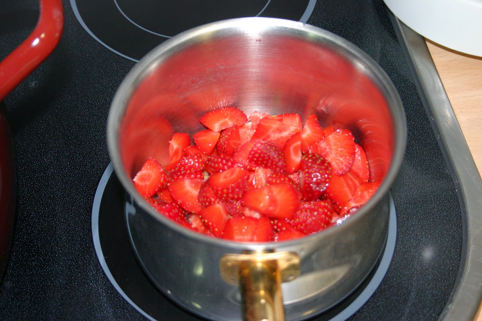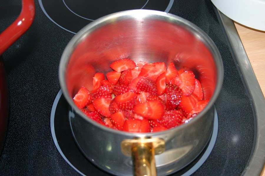 ahora vamos con el coulis, echamos en una cazuela las fresas limpias y cortadas en trozos