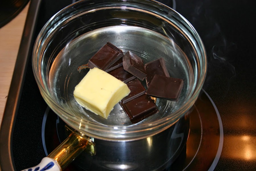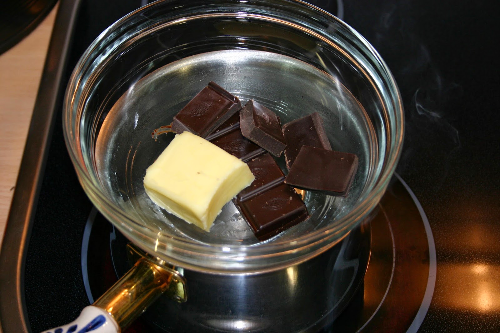 a continuacion en un bolechamos la mantequilla y el chocolate y lo ponemos sobre una cazuela con agua y la llevamos a ebullicion