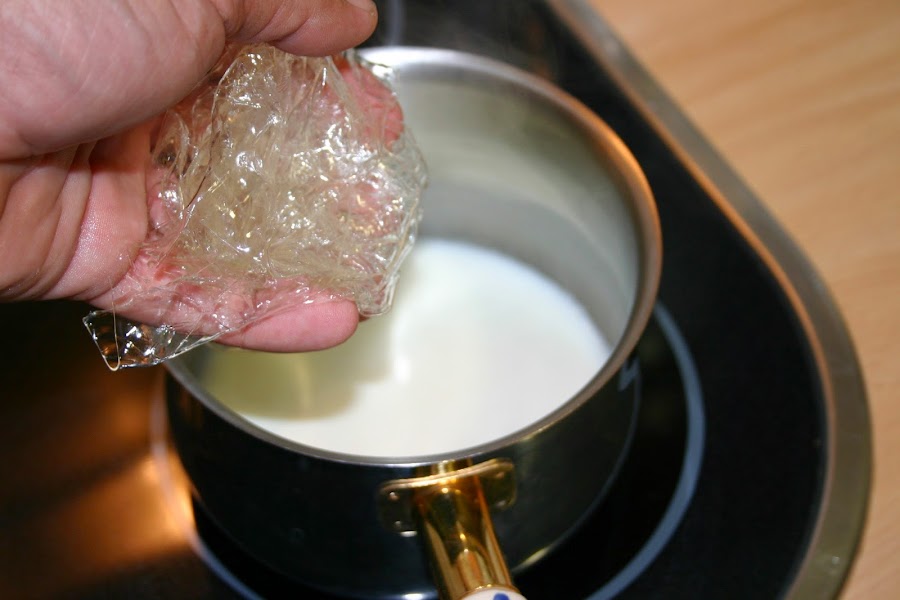 echamos la leche que teniamos reservada con las laminas de gelatina