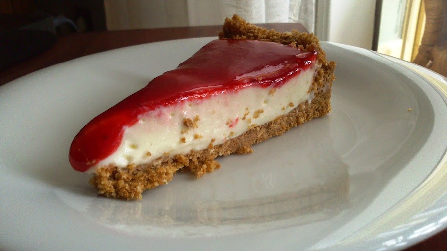 Con la ayuda de una batidora de mano trituramos y pasamos por un colador para no encontrar semillas y que quede completamente fino. Dejamos enfríar y lo echamos por encima del pastel.