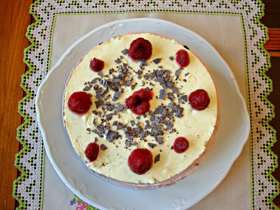 Luego la decore con unas fresas y frambuesas en almíbar y unas pocas virutas de chocolate.