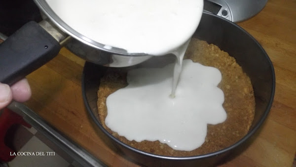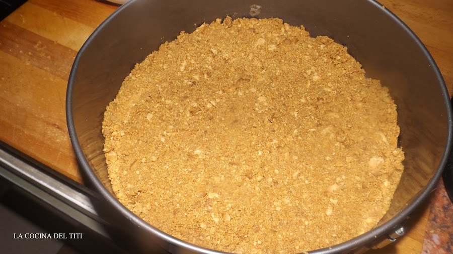 1º Preparamos la base en el que trituramos las galletas en el robot o picadora y posteriormente añadimos la mantequilla a temperatura ambiente. Pondremos sobre la base que vayamos a utlizar y metemos en el frio al menos una hora para que se compacte