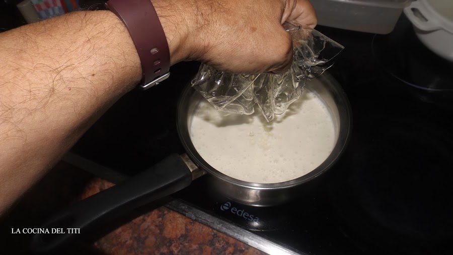 2º Pasamos al relleno en el que primero hidratamos la gelatina con agua fria diez minutos antes. En un cazo calentamos la nata (crema de leche) junto al queso y el azucar sin llegar a hervir y a fuego suave. Echamos la gelatina movemos y apartamos.