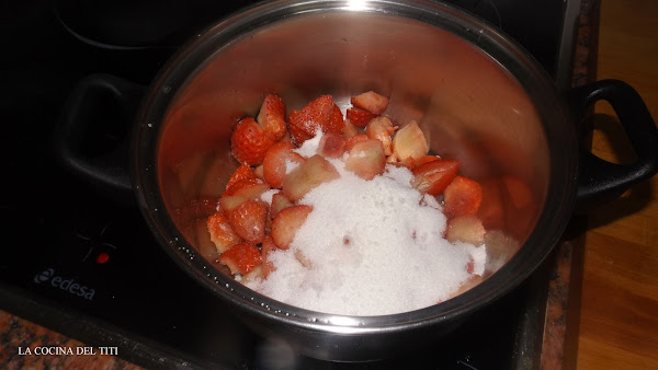 4º Turno para la mermelada en el que lavamos y cuarteamos las fresas, llevamos a ebullicion a temperatura moderada junto con el azucar dejando hervir durante unos 15 minutos aproximadamente en el que el brillo se pronunciara bastante y el almibar espesara. Retiramos y dejamos enfriar
