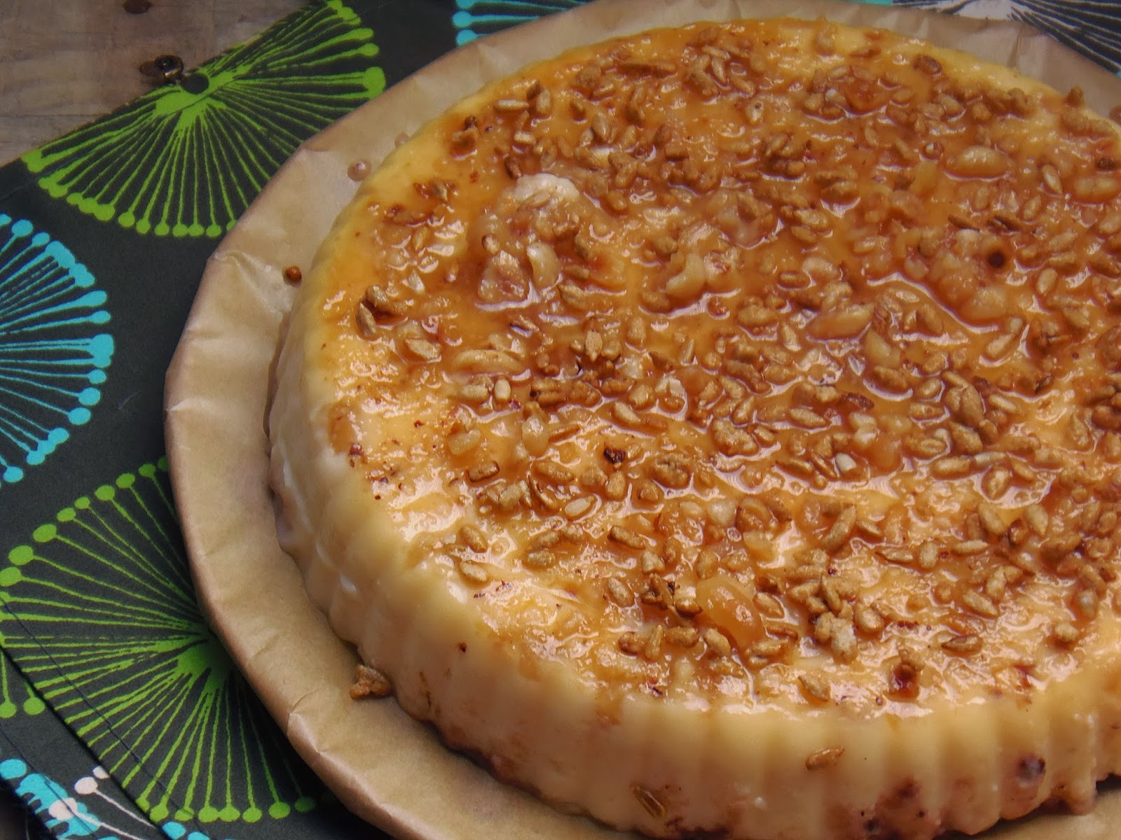 - Hacemos el caramelo y lo echamos en el fondo de un molde o bandeja de cristal, añadimos también los frutos secos.