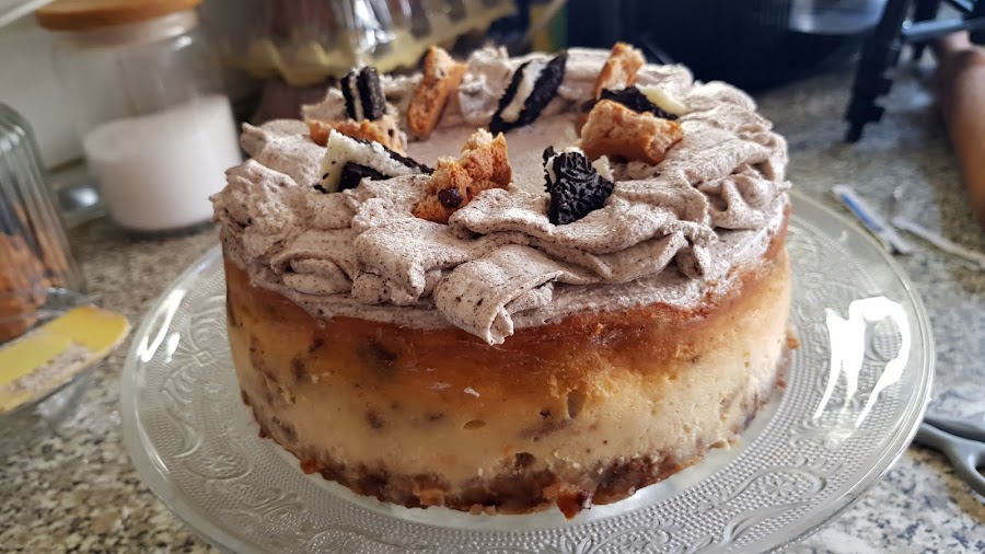 23. Y acabamos decorándola con la mezcla de nuestra manga pastelera y unas cuantas galletas troceadas. Guardadla en la nevera. Recordad que la cobertura es nata (crema de leche).