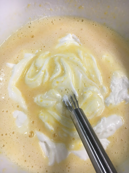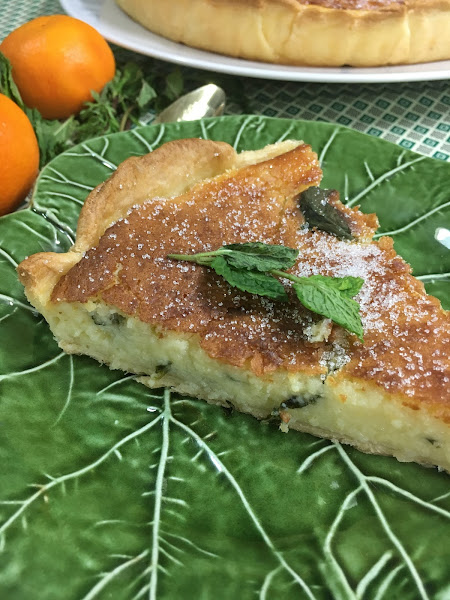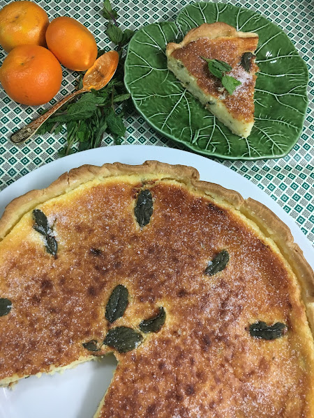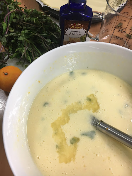 Se prepara el relleno batiendo en un bol los 4 huevos, el azúcar, luego la ralladura de mandarina, 6 hojas de hierbabuena y la cucharada de agua de azahar.