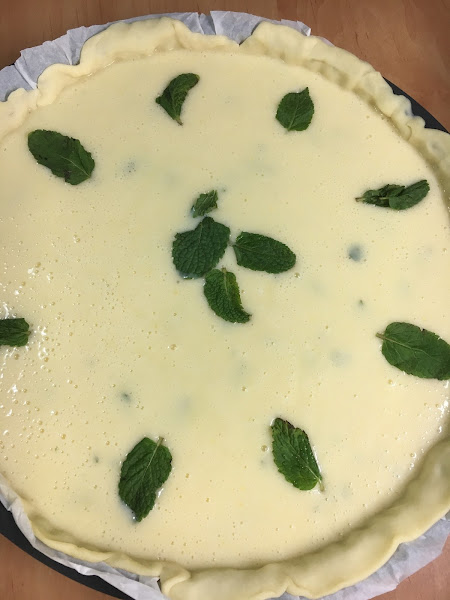 Se vierte la mezcla sobre la base, se colocan unas hojas de hierbabuena de decoración y se hornea unos 35 minutos.