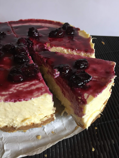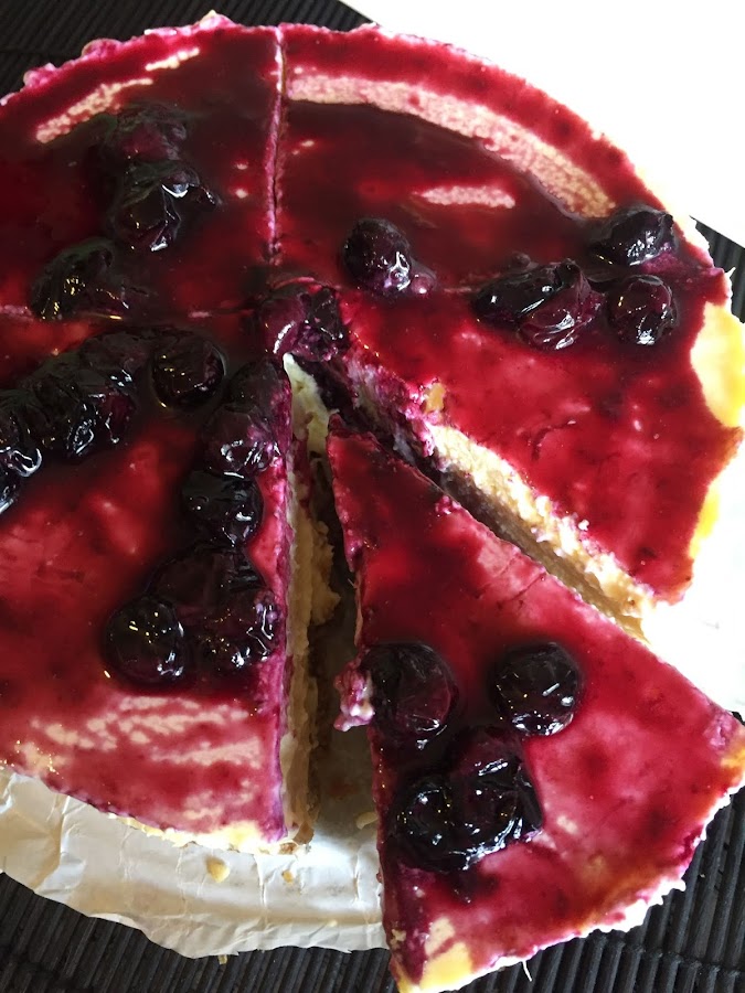 Al momento de desmoldarla, tenia preparado en una taza un puñado de arándanos hechos en el microondas por un minuto, que luego puse como topping al cheesecake, buen provecho!!.