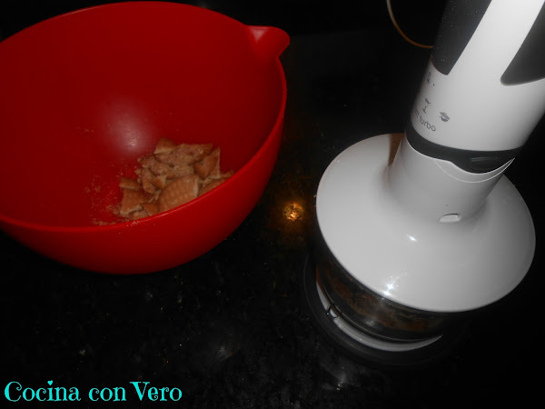 Metemos las galletas previamente un poco desmenuzadas por tandas en la picadora de la batidora y las trituramos hasta hacerlas polvo.