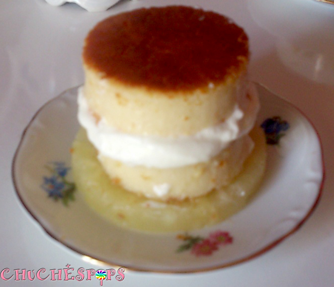 Simplemente sobre un plato, he puesto una rodaja de piña, y encima, he colocado un trozo de la tarta de queso que previamente, he cortado con un cortador circular encima, lleva una capa de nata montada (crema de leche) y sobre la nata (crema de leche) he colocado otro trozo de tarta de queso.