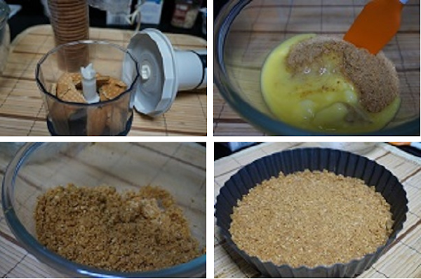Primero trituraremos las galletas, las ponemos en un bol y añadimos la mantequilla derretida, lo mezclamos bien. Cogemos el molde donde vamos a preparar la tarta que sea desmontable. Ponemos las galletas en el fondo del molde haciendo la base. Lo guardamos en la nevera.