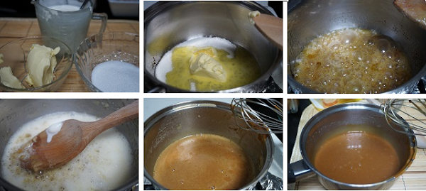 Ahora vamos a preparar el caramelo. Ponemos un cazo a fuego bajo.Añadimos el azúcar y la mantequilla; poco a poco se irá haciendo el caramelo. Cuando empiece a tomar un color muy claro, apartamos del fuego y añadimos la nata (crema de leche). Removemos, ponemos al fuego y dejamos que se termine de cocinar y hasta que quede como una crema. El fuego siempre bajo, para que no se queme y no coja mal sabor.