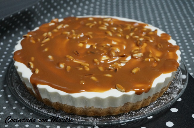 Una tarta de queso que no necesita horno, se prepara con cuajada, y con la delicia de los piñones y la salsa de caramelo hace de esta tarta un contraste de sabores riquísimos; suave del queso y el intenso sabor del caramelo. ¡¡Es perfecta!!