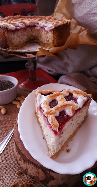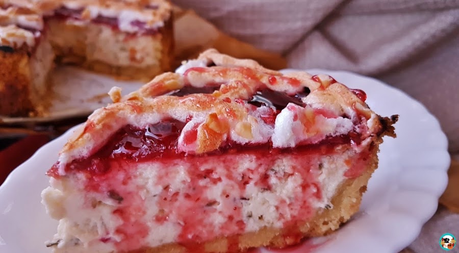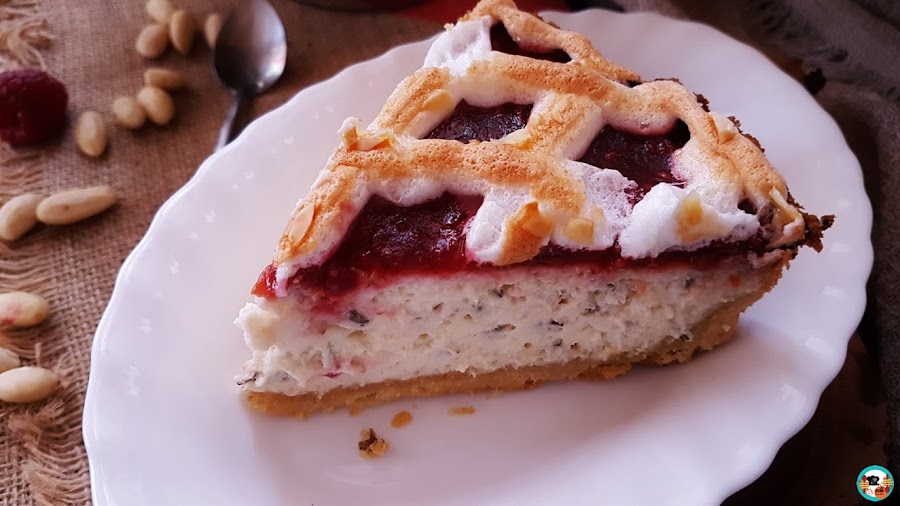 Tarta de queso con almendras molidas, salsa de frambuesas y flores secas de lavanda. También tiene una crujiente masa quebrada con sabor a limón y mantequilla, además, de todo eso, es pura poesía del campo. La tarta lleva una rejilla de merengue gratinado con trocitos de almendras tostadas.