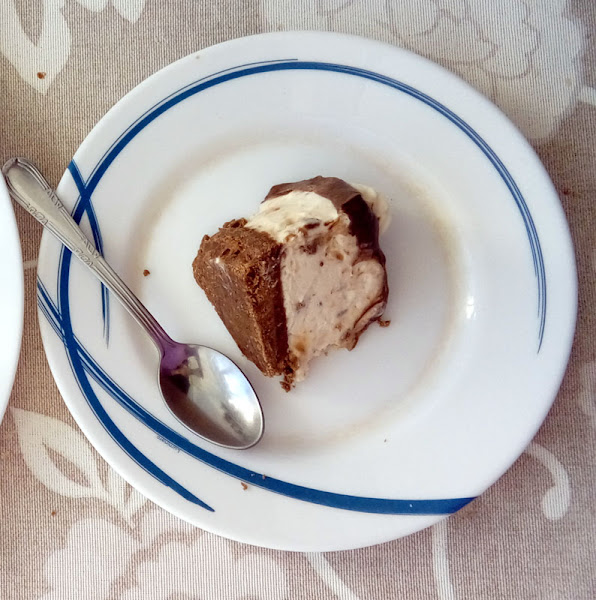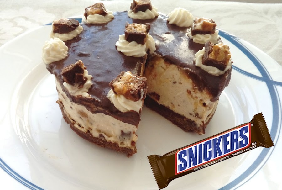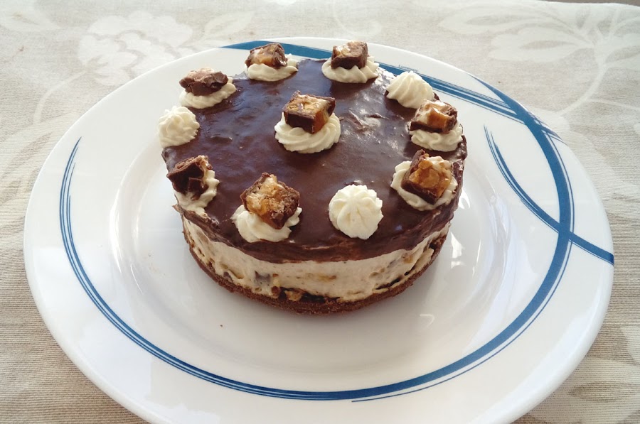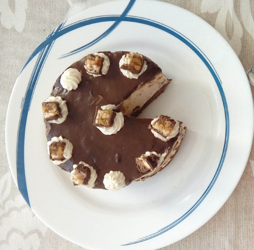 Esperamos unas 4 horas y con nata montada (crema de leche) lo adornamos y le ponemos trocitos de snicker encima para decorar.