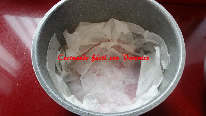 Se cogen pliegos de papel sulfurizado (de horno) y de pliego en pliego se hace lo siguiente: se mojan debajo del grifo, tras lo cual se escurren y se van colocando de uno en uno en la cubeta, hasta cubrir lo necesario para que la crema de la tarta no tenga ningún resquicio para salir del papel y se quede todo el contenido dentro del mismo. Después se podrá quitar bien del fondo. Ésto no lo hago para que no se pegue a la cubeta sino para poder después tirar de los pliegos de papel y sacar la tarta. Éste truco del papel mojado no lo sabía, nunca lo he visto en ningún sitio. El motivo de mojarlos es para que se pueda manejar bien para colocar en cualquier molde, ya sea esta cubeta o moldes de horno, son algo rígidos y mientras los colocas por un lado se caen por el otro. Así mojados ya no se mueven. Si alguien más sabe de este truco lo lleva muy calladito, será para que no tengamos los mismos conocimientos, pero yo estoy por compartir con vosotros todos los secretos para que queráis volver a entrar a mi blog.