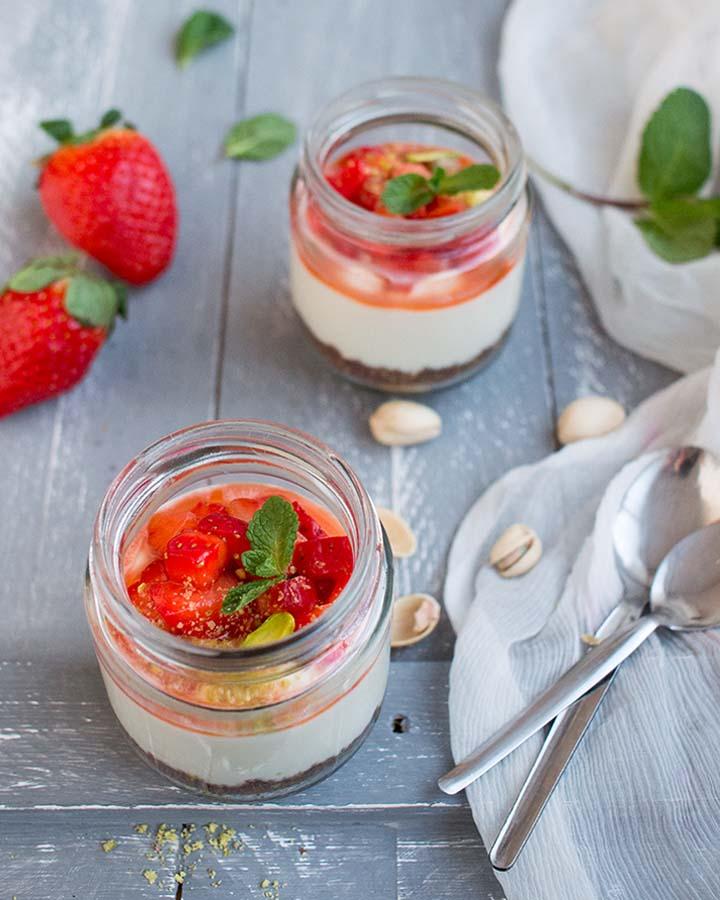 En un bol, añade el yogurt, el queso crema, el zumo de limón y el azúcar. Mezcla con unas varillas manuales hasta que todos se hayan mezclado. Vierte sobre la base de galleta en los vasitos. No los llenes hasta arriba y añade las fresas que has preparado a modo de topping. Reserva en la nevera hasta el momento de servir. Decora con una ramita de menta y a disfrutar.
