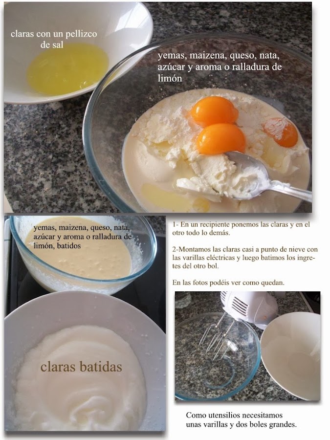 En un bol grande ponemos todos los ingredientes menos las claras, que las reservaremos en el otro bol.