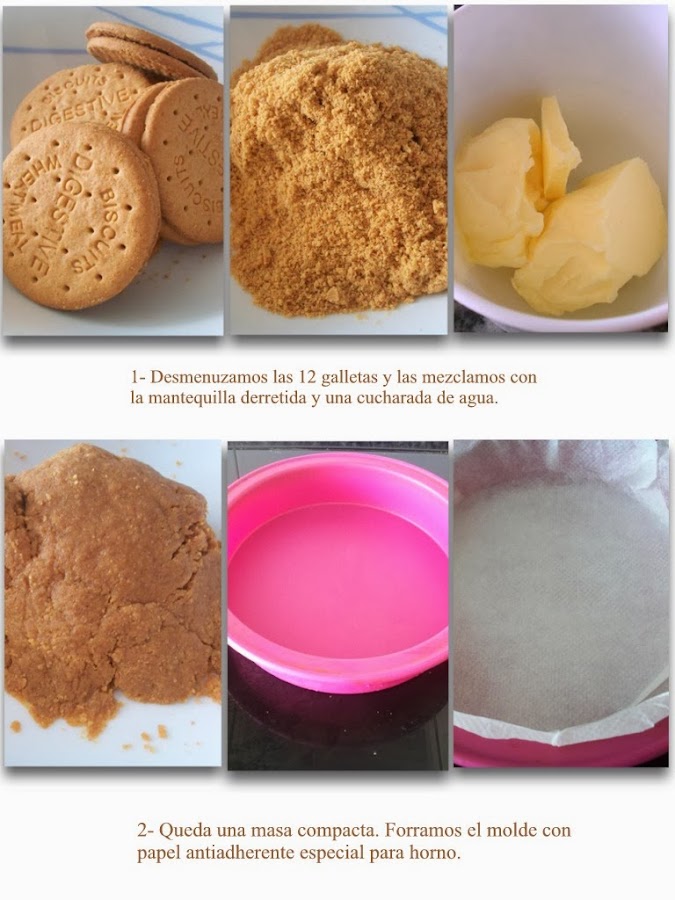 Sacamos el recipiente con la base de galletas de la nevera y echamos toda la preparación, veremos que llena casi todo el recipiente.