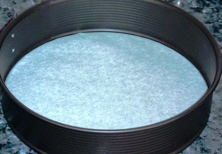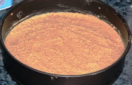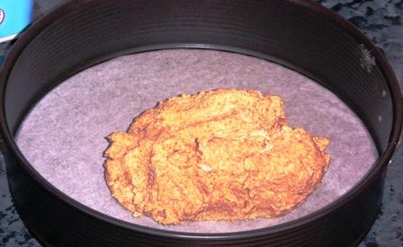 En el molde que será un aro desmontable, tenemos la opción de poner un papel de horno como podéis ver en la foto, nos protege el molde y evita que se salga líquido, pero por otro lado tiene el pequeño inconveniente de que luego tenemos que quitarlo al cortar la tarta?, no es muy molesto, para mi gusto es beneficioso. Habremos preparado una masa con las galletas molidas y la mantequilla, la cantidad será la suficiente para realizar la pasta, esta dependerá da la cantidad de galleta y se ve fácilmente cuando está bien hecho, no debe quedar ni muy seco, ni muy graso, se ve fácil, no os preocupéis. Cubrimos el fondo del molde con esta masa procurando que quede bien repartido y en que se ha enfriado un poco añadimos la mezcla.