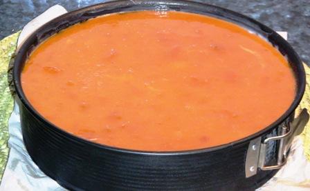 Ponemos la mermelada en un cazo y añadimos 2 o 3 placas de gelatina, o la cantidad en polvo recomendada.., y en que se ha calentado y vemos que la gelatina se ha fundido, lo retiramos, dejamos enfriar un poco y lo echamos por encima de la tarta, ahora ya solo falta que se enfríe y cuaje, como es una capa fina, esto ocurre enseguida, pacienciaaaa jejejeje.